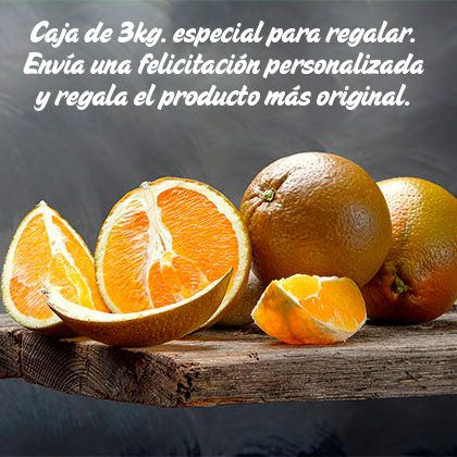 Regala esta caja de 3kg. de naranjas Navel Chocolate. Seguro que nunca han probado la única naranja que no es naranja. Tu regalo llegará directametne al destino que nos indiques con una felicitación personalizada en la caja. Puedes personalizar el texto que quieres que pongamos en la caja y también inlcuir una nota dentro de la misma. Nosotros nos encargaremos de prepararlo todo y hacerlo llegar a quien nos indiques.